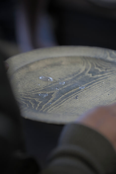 Being inspired by the wooden crafts at [Shimoo Design], Chef Taniguchi decided to give first priority to the tableware for his new restaurant. Chef Taniguchi said, [I decided to order the tableware for my new restaurant from Mr. Shimoo, a long time ago. Do not ask me why, as I cannot give a good answer. However, his works have impressed me since the first time I visited his workshop. They were what I was looking for]. Mr. Shimoo also laughed and said, [I was impressed to hear the idea of Chef Taniguchi, to make use of the whole restaurant to dispatch Toyama. I felt like cooperating with him from the bottom of my heart. I was surprised to receive his order for all the dining tables, as it was only 1 month prior to the opening. I made my best efforts to make it in time].